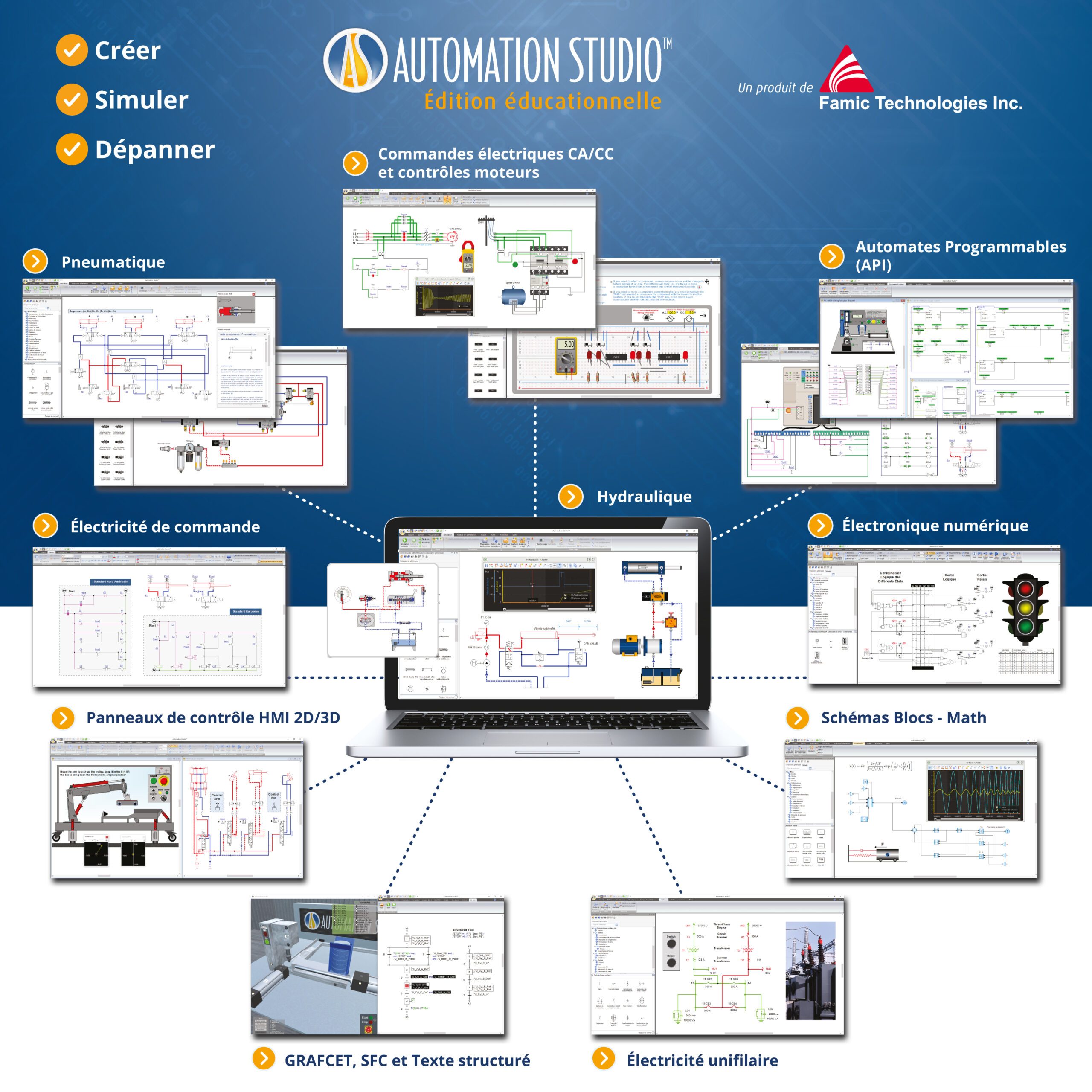 La solution logicielle par excellence pour l’enseignement, la formation et l’apprentissage des technologies mécatroniques, de l’automation, électriques, hydrauliques et pneumatiques.